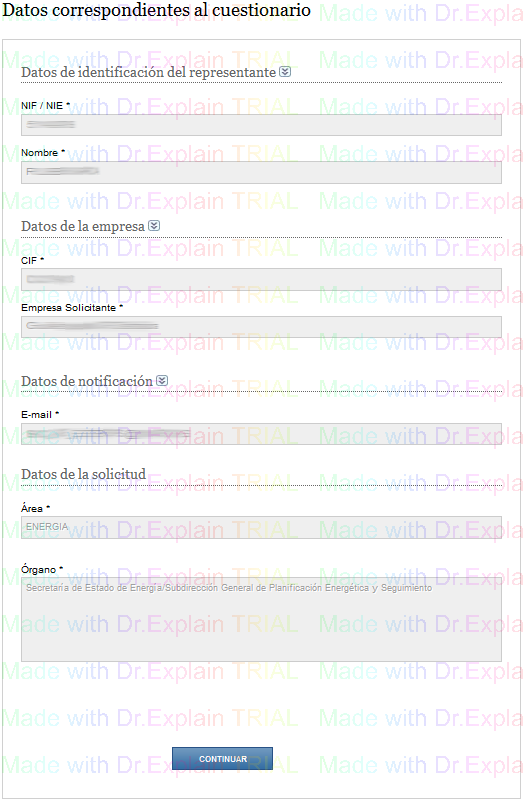 A continuación se muestra una pantalla con la información de los datos del cuestionario, donde deberá pulsar el botón CONTINUAR. Esta pantalla es común a todos los tipos de cuestionario.