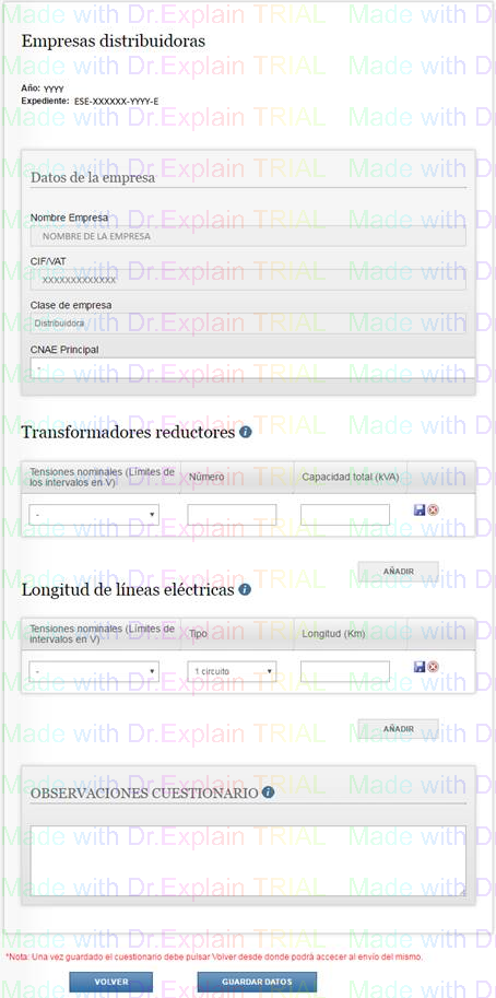 En esta pantalla podrá seleccionar el CNAE Principal, introducir datos de Transformadores, de Longitudes de líneas eléctricas e introducir comentarios al cuestionario