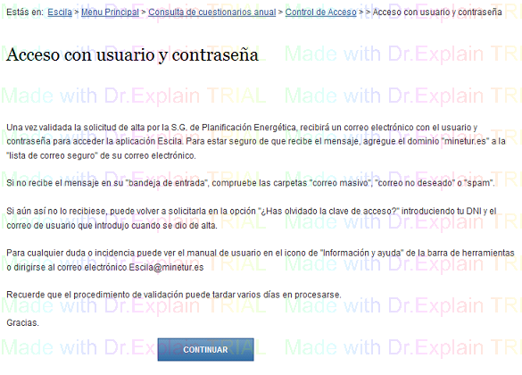 Una vez estén todos los datos introducidos, al pulsar el botón Guardar, aparecerá la siguiente pantalla indicando que se va a proceder a una validación por parte de la Subdirección General de Prospectiva y Estadísticas Energéticas. Una vez realizada la validación el usuario recibirá un email con la contraseña de acceso a ESCILA.