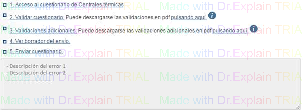 Antes de proceder a enviar el cuestionario, puede realizar una serie de validaciones adicionales, el resultado de dichas validaciones no son bloqueantes para el envío del cuestionario. Para ello pulse en el enlace el “3. Validaciones adicionales” del apartado 4.4.1.1 para centrales térmicas o del apartado 4.4.1.3 para centrales no térmicas.