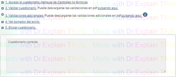 Antes de proceder a enviar el cuestionario, debe proceder a validar el mismo, si los datos del cuestionario no son correctos, no podrá realizar el envío. Para ello pulse en el enlace el “2. Validar cuestionario” del apartado 4.4.2.1 para centrales térmicas o del apartado 4.4.2.2 para centrales no térmicas.